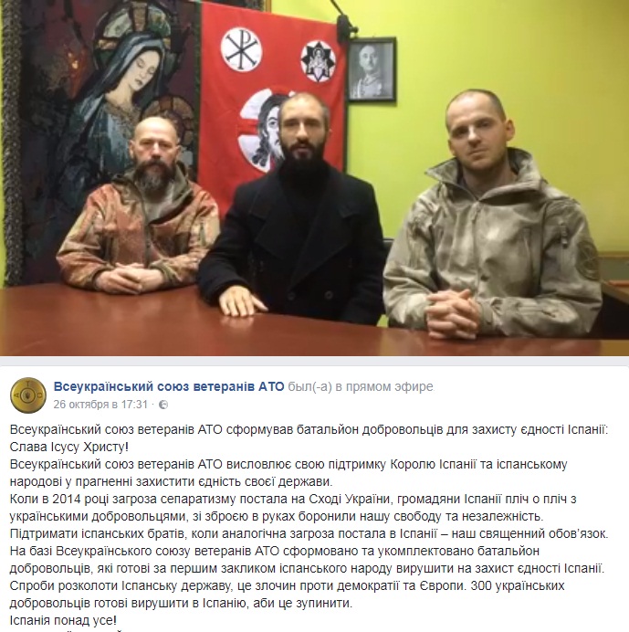 На своей странице в Facebook они опубликовали заявление и видеообращение, где сообщают о формировании батальона для защиты единства Испании, готового выступить по первому требованию.