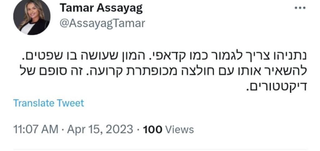 Министр национальной безопасности Итамар Бен-Гвир ответил: «Я направил этот подстрекательский пост специальной группе по борьбе с подстрекательством к насилием и призываю омбудсмена одобрить начало расследования сегодня вечером. Мы должны прекратить это подстрекательство, прежде чем заплатим высокую цену!»