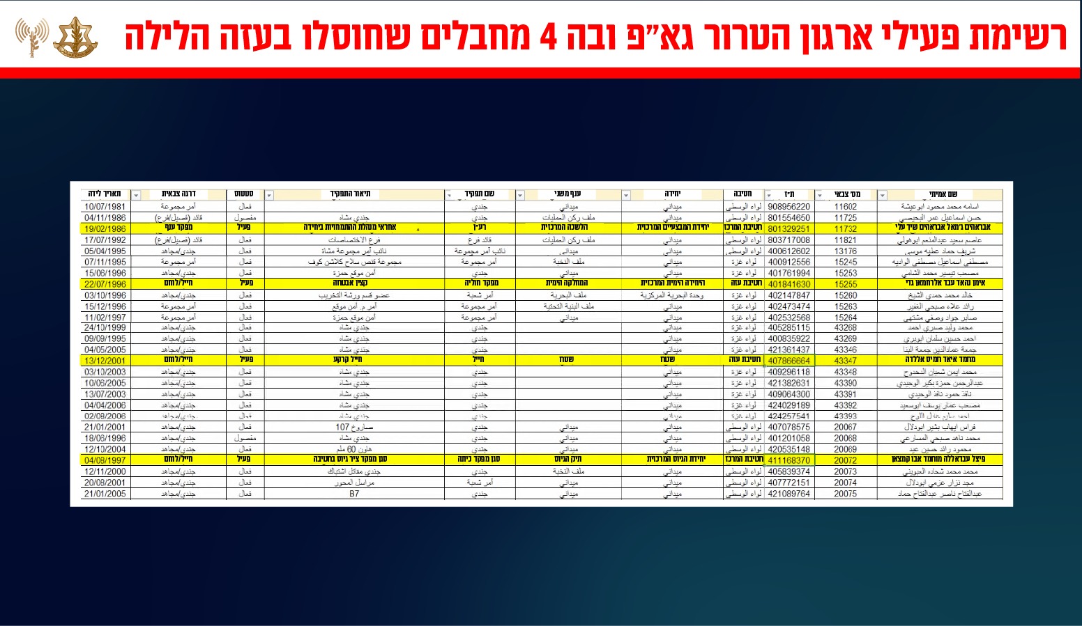 В атакованной машине также уничтожены: террорист Иман Нахад Абдель Рахман Гади, ранее входивший в военно-морские силы “Исламского джихада”, и террорист в сфере боевой информации Фади Ихаб Мухаммад Рамадан Хасан.