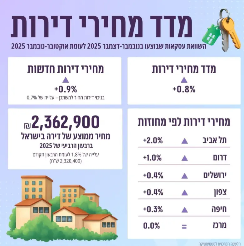В годовом сравнении (январь 2026 года по сравнению с январем 2025 года) индекс цен на жилье вырос на 0,4%. Наиболее заметный рост зафиксирован в Иерусалимском, Северном, Южном и Хайфском округах, тогда как в Тель-Авиве и Центральном округе отмечено снижение.