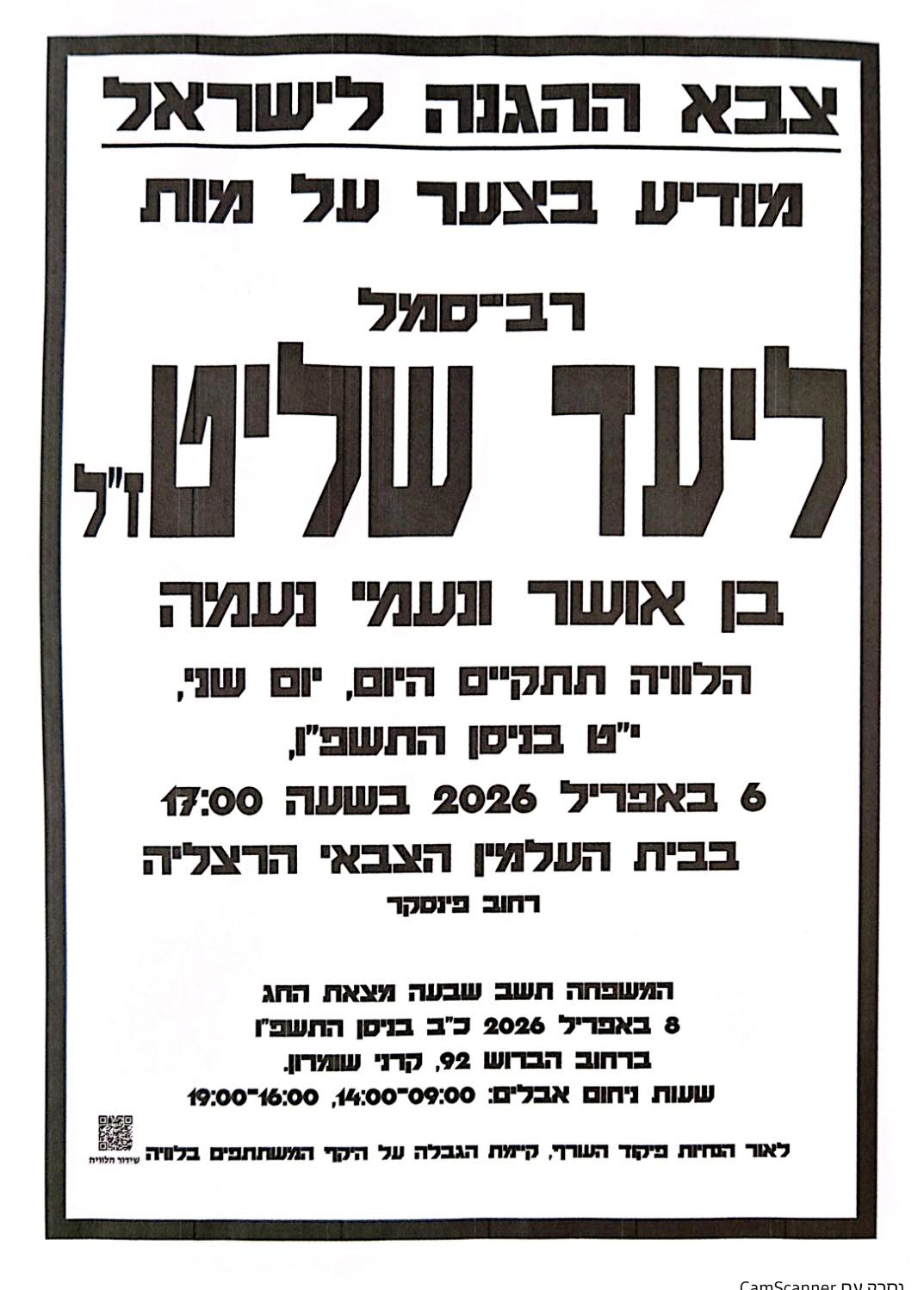 Его похороны состоятся сегодня (6 апреля) в 17:00 на кладбище Герцлии, на военном участке.