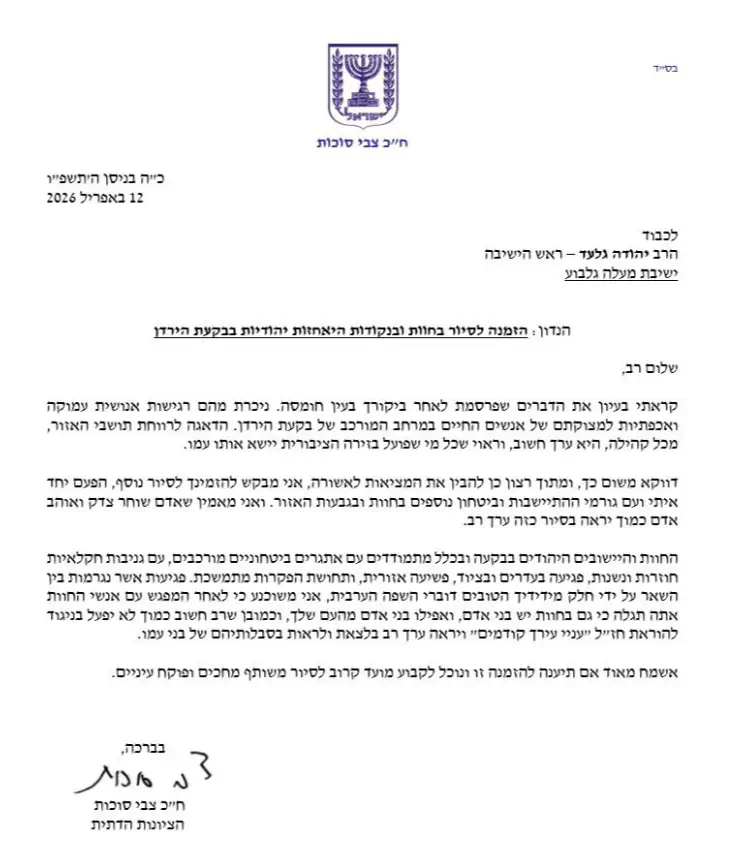 В завершение письма Суккот призвал назначить ближайшую дату совместной экскурсии с целью продвижения более широкого и сбалансированного понимания реальности в долине Иордана.