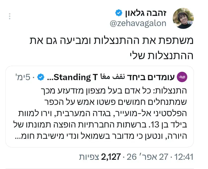 Бывшая депутат Кнессета и представительница левого лагеря Захава Гальон опубликовала заявление с извинениями перед Шмуэлем Венди, бывшим генеральным директором ешивы Хомеш - после того, как приписала ему убийство палестинца.
